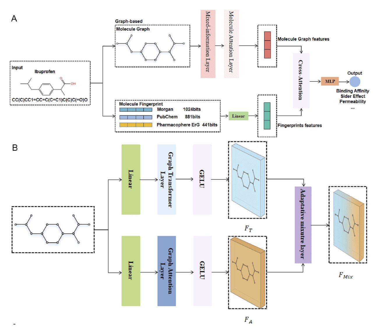 最妙的地方在于那个所谓的「自适应融合机制」。这就像一个智能的自动对焦系统。如果模型要预测的性质(比如水溶性)更依赖分子整体的极性表面积,系统就会给全局信息(Transformer 的输出)更高的权重。反之,如果要预测某个位点的代谢稳定性,那局部化学环境(GAT 的输出)就更关键。这个机制让模型自己学会了「看情况办事」,而不是一刀切。
