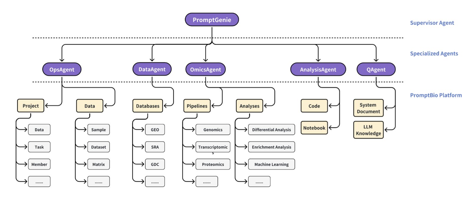 PromptBio 这个平台,就是想把我们从这场灾难中解救出来。它不是又一个孤零零的分析工具,它的架构是一个「多智能体系统」,说白了,就是给你配了一个 AI 团队,有总管,有干活的专员,各司其职。