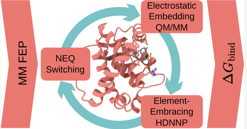 于是,我们有了 QM/MM,一个折衷:把关键区域(比如配体和结合口袋)用 QM 精算,其他部分用 MM 粗算。但这依然不够。要做自由能微扰(FEP)这种需要海量采样的计算,即使是 QM/MM 也还是太慢了。
