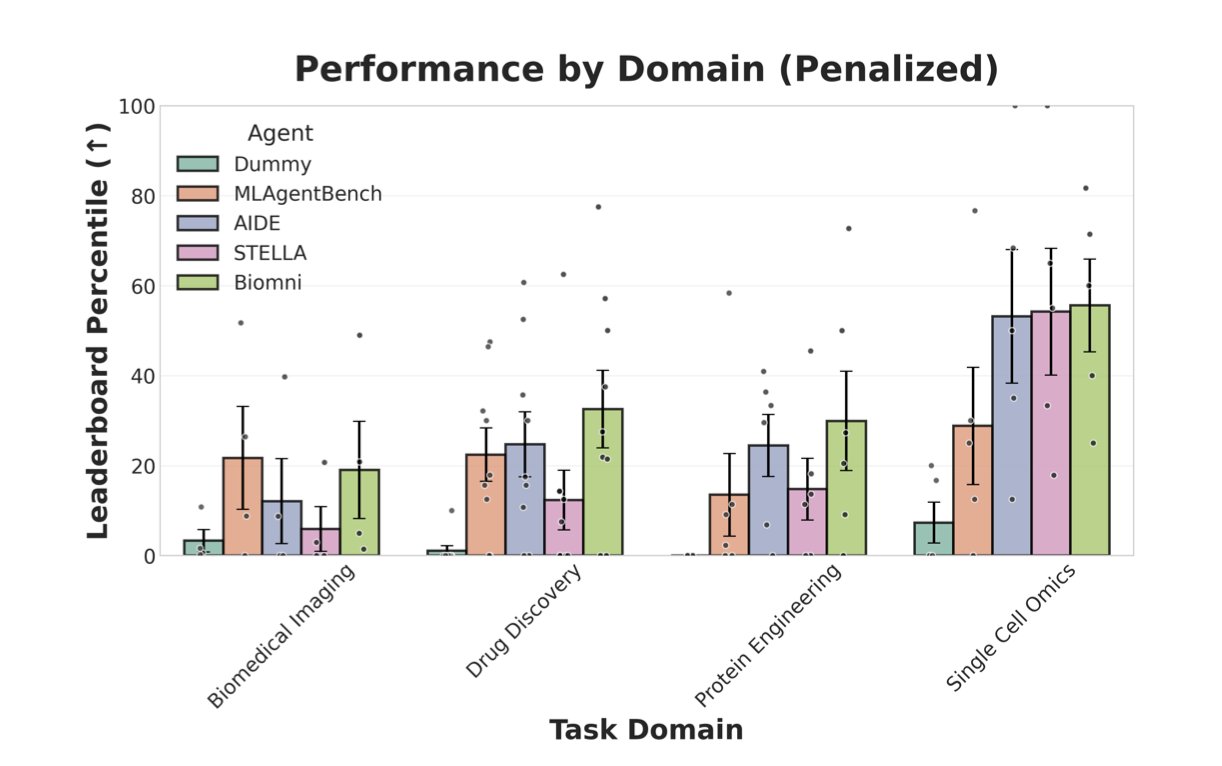 研究者拉了四个 AI 代理来考试:两个是生物医药领域的「专科生」(STELLA, Biomni),另外两个是「通才生」(AIDE, MLAgentBench)。