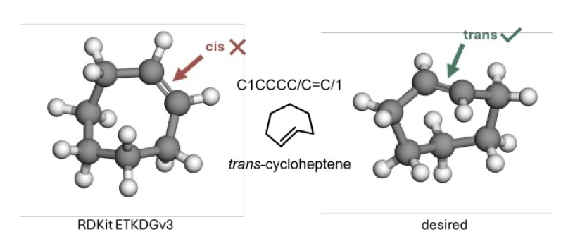 Common toolkits like RDKit and Open Babel use conformation generation algorithms and force fields trained on large datasets of “normal” molecules. They have a built-in memory for the standard 109.5° bond angle of an sp³ carbon and the 120° of an sp² carbon. But the bonds in strained ring systems are like steel bars that have been bent out of shape; their angles and lengths deviate from the norm. Standard algorithms get confused by this. They either fail with an error or force standard rules onto the molecule, generating a physically impossible conformation.
