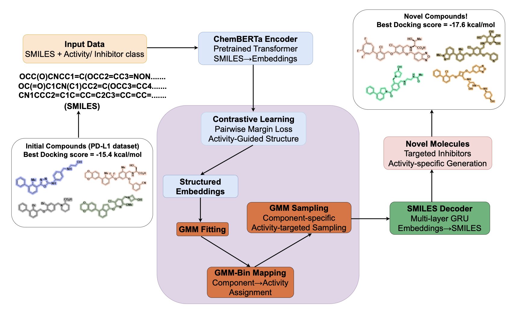 The second step is to create new molecules from these advantaged regions. Once the map is drawn, the researchers use a Gaussian Mixture Model (GMM) to locate the clusters of the most active molecules. This is like finding “treasure spots” on the map. The model then samples new molecular coordinates near these spots and uses a decoder to translate these coordinates into new chemical structures.
