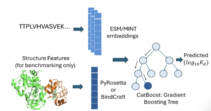 BindPred then feeds these two vectors into a gradient-boosted tree model, which directly predicts their binding affinity. The entire process goes from sequence input to affinity output in one step.