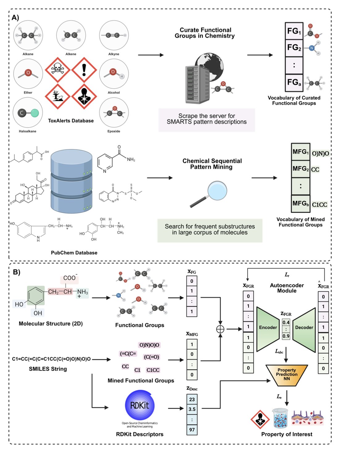 Next, the model uses an autoencoder to process this functional group information, compressing the high-dimensional combination into a low-dimensional mathematical vector. This acts like a “translator,” converting the language of chemistry into the language of math that machines can efficiently understand. By pre-training on a vast amount of unlabeled molecular data, the model learns the “grammar rules” and combination patterns of functional groups on its own.