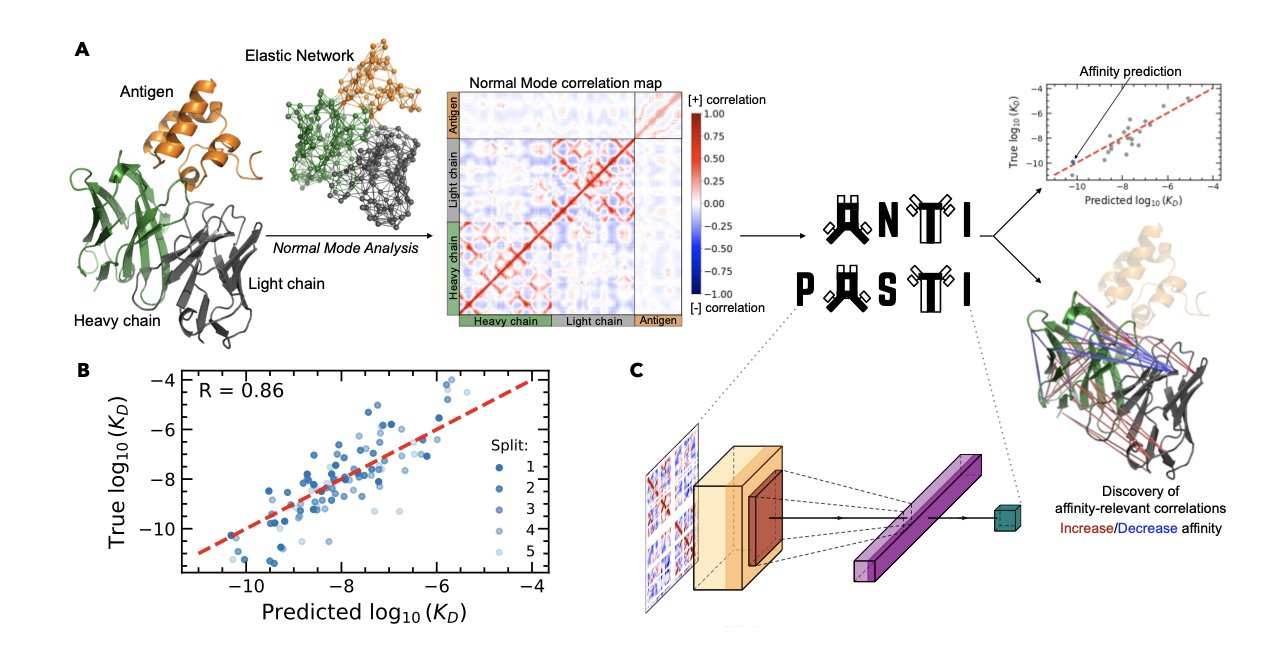 The ANTIPASTI model predicts the overall binding affinity between an antibody and an antigen. It treats the antibody-antigen complex as an Elastic Network Model composed of amino acids (nodes) and their interactions (springs). It then uses a Convolutional Neural Network (CNN) to learn the dynamic properties of this network, understanding the dynamic changes that occur when the complex binds. The model’s predicted affinity achieved a Pearson correlation of 0.86 with experimental data.