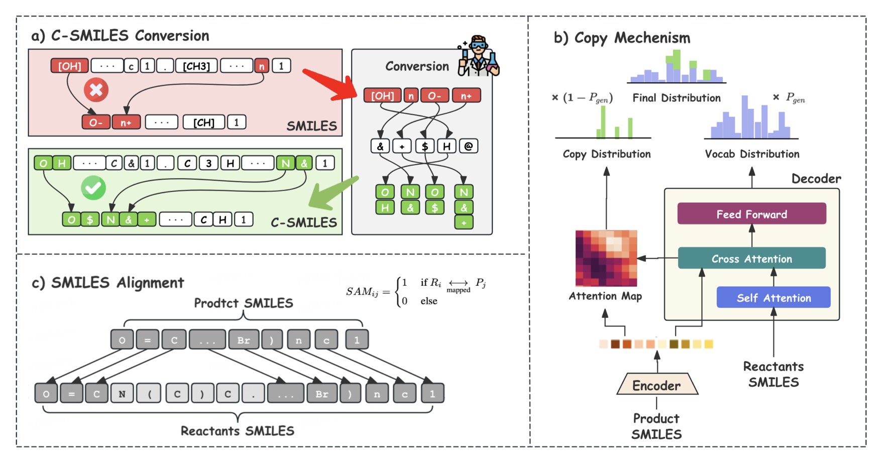 To do this, they designed a new molecular representation called C-SMILES. Traditional SMILES strings are like long, run-on sentences, making it hard to distinguish key parts. C-SMILES breaks them down into “atom-bond” pairs, like turning a long sentence into a clear list of phrases. This allows the model to easily spot which “phrases” have changed and which have not when comparing reactants and products.