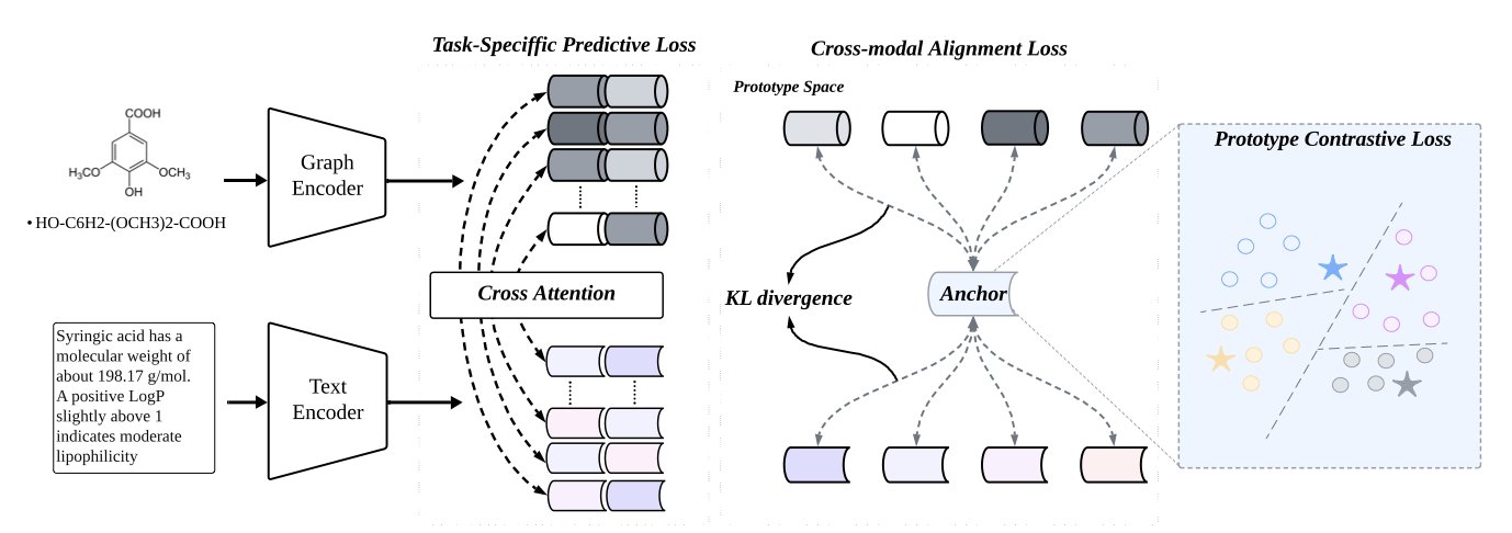A “prototype” can be understood this way: to predict if a molecule is toxic, you can define abstract “prototype” vectors for the “toxic” and “non-toxic” categories, representing the core features of each class. ProtoMol’s job is to train a model to map both the structural information from a molecule’s graph and the information from its text description into this prototype space.