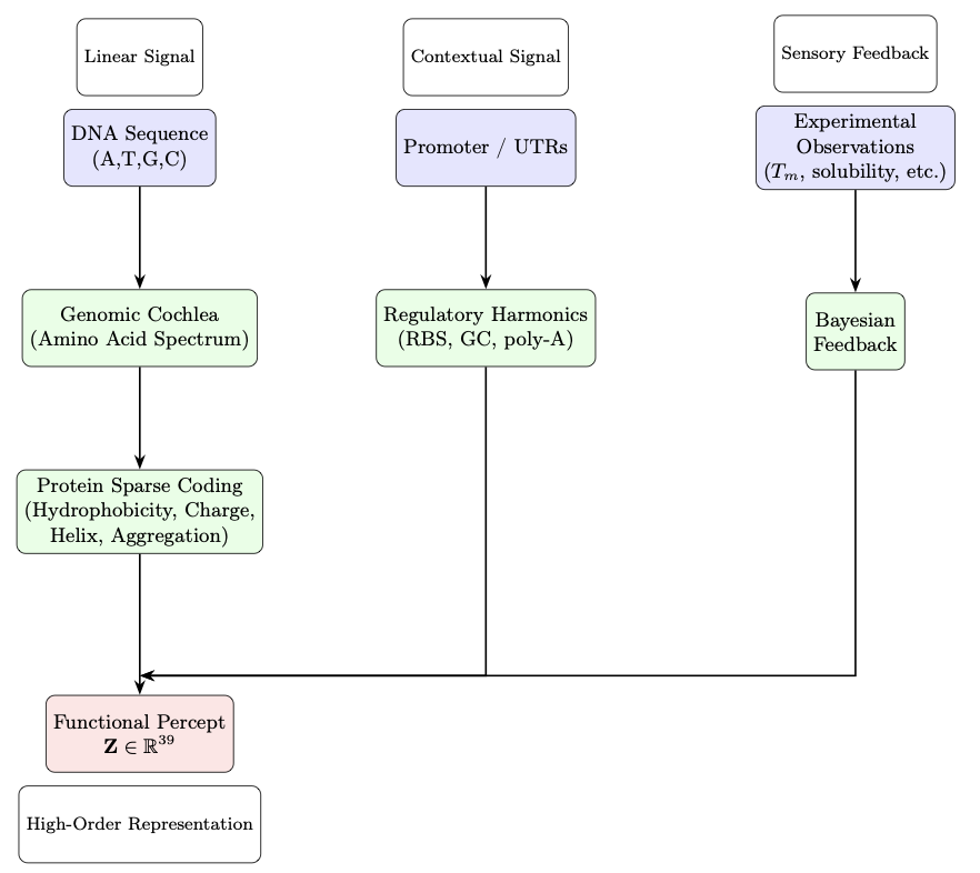 First, the “Genomic Cochlea” module analyzes amino acid composition. Next, the “Protein Sparse Coding” module extracts key biophysical features. Finally, the “Regulatory Harmonics” module incorporates contextual information from gene expression. Through this process, GPF converts a protein sequence into a 39-dimensional functional numerical representation.