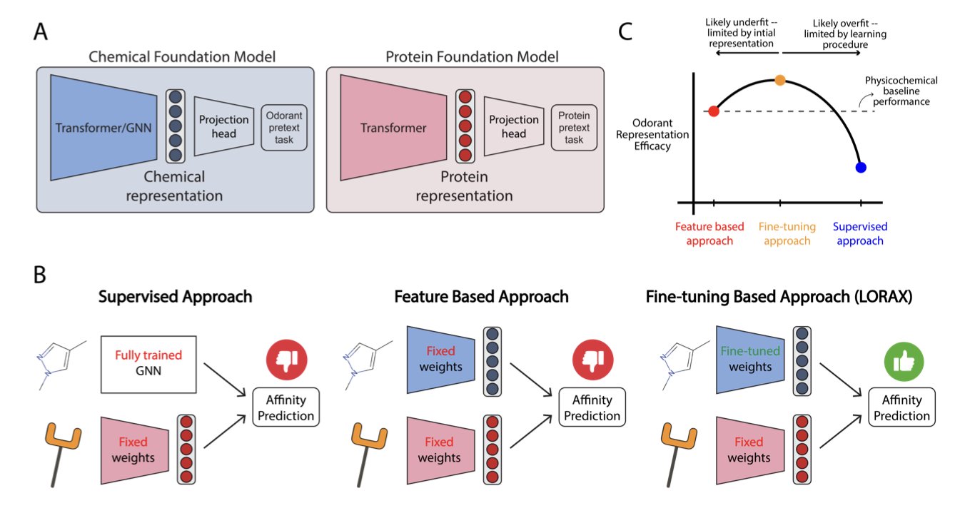 This work shows how clever fine-tuning can adapt existing foundation models to solve problems like olfaction, where data is limited but the chemical space is vast. As new chemical foundation models continue to emerge, methods similar to LORAX can be used to explore the mysteries of smell even further.