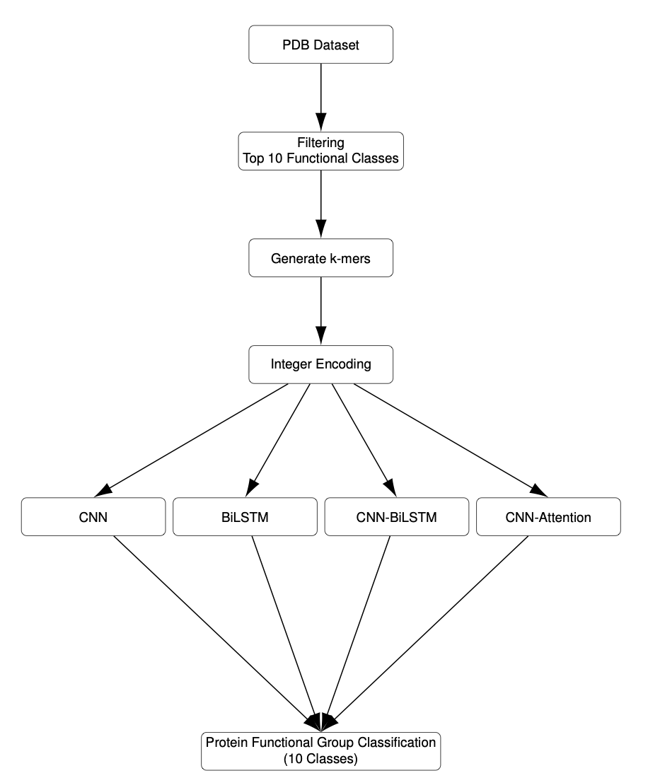 The study set up a function classification task using the PDB database to compare four architectures: a CNN, a BiLSTM, a CNN-BiLSTM, and a CNN with Attention. The Convolutional Neural Network (CNN) came out on top with 91.8% validation accuracy.