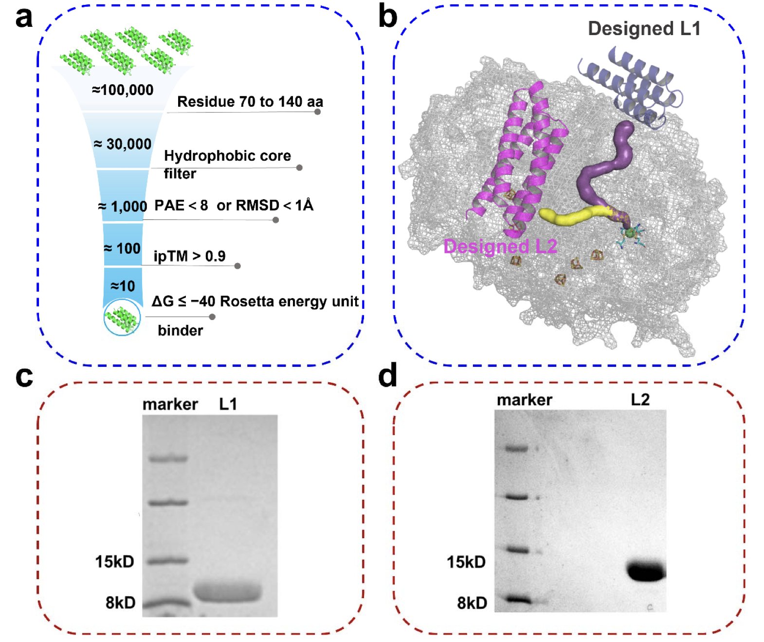 The team used a trio of AI tools: RFdiffusion to generate the backbone, ProteinMPNN to design the sequence, and AlphaFold to predict the structure. Out of about 100,000 candidates, they selected two high-affinity binders, L1 and L2.