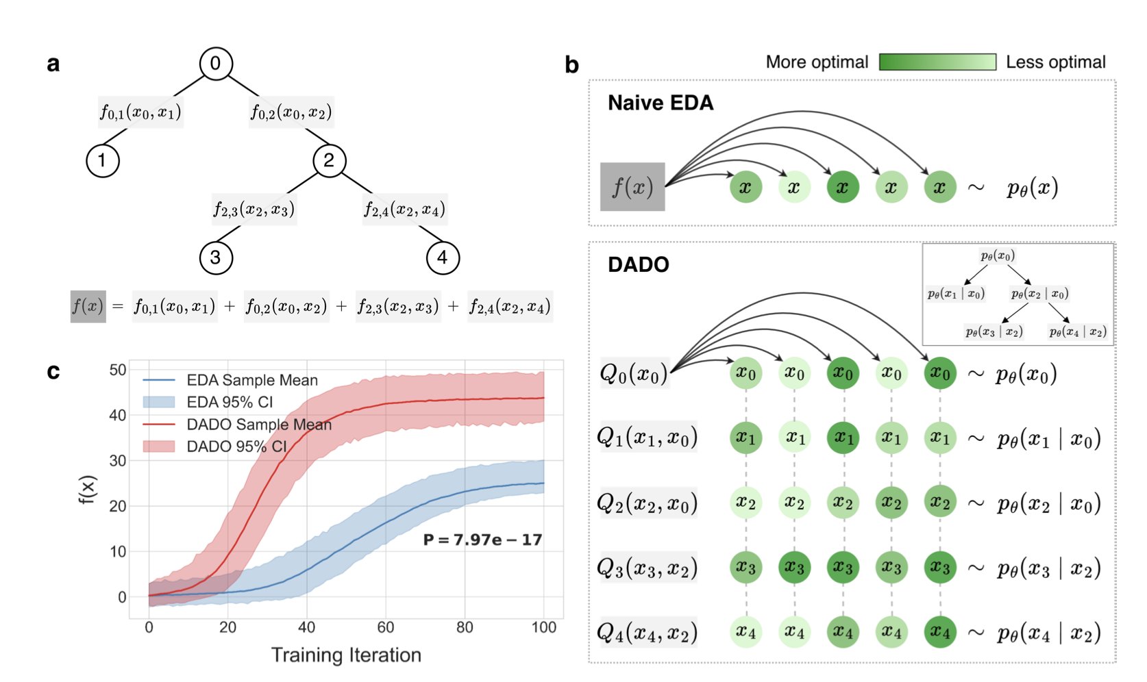 The researchers tested DADO’s effectiveness on both synthetic datasets and real protein design tasks. The results showed that compared to traditional EDA algorithms, DADO found protein sequences with the target properties faster and more accurately, showing its potential for solving real-world problems.