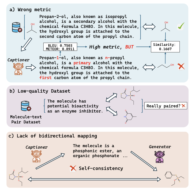 Current evaluation systems rely too much on Natural Language Processing (NLP) metrics like BLEU or ROUGE. In NLP, “apple” and “fruit” are semantically close. But in chemistry, a benzene ring and a pyridine ring differ by just one atom, yet their properties are completely different. Traditional metrics focus on text overlap and can’t catch this kind of “chemical distortion.”