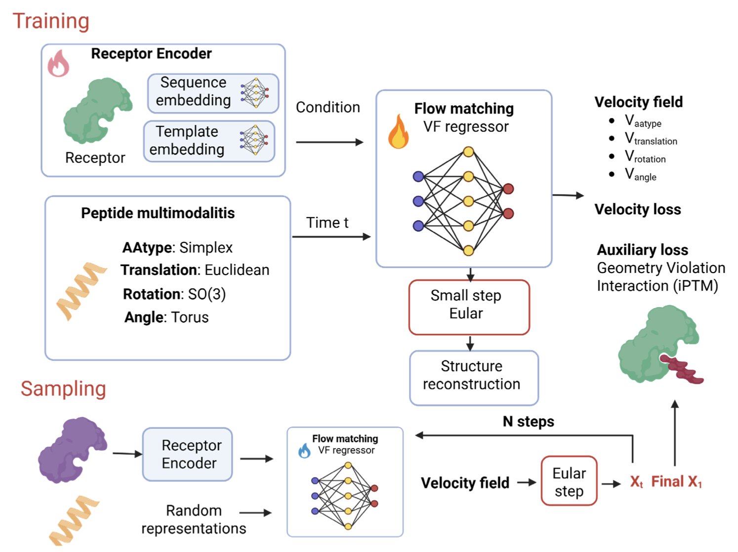 ApexGen offers a new AI framework to break this deadlock. It uses flow matching in a mathematical space called a “product manifold” to handle a peptide’s backbone torsion, rigid body position, amino acid type, and side-chain angles all at once. The peptide’s sequence identity and geometric structure evolve together in the same process.