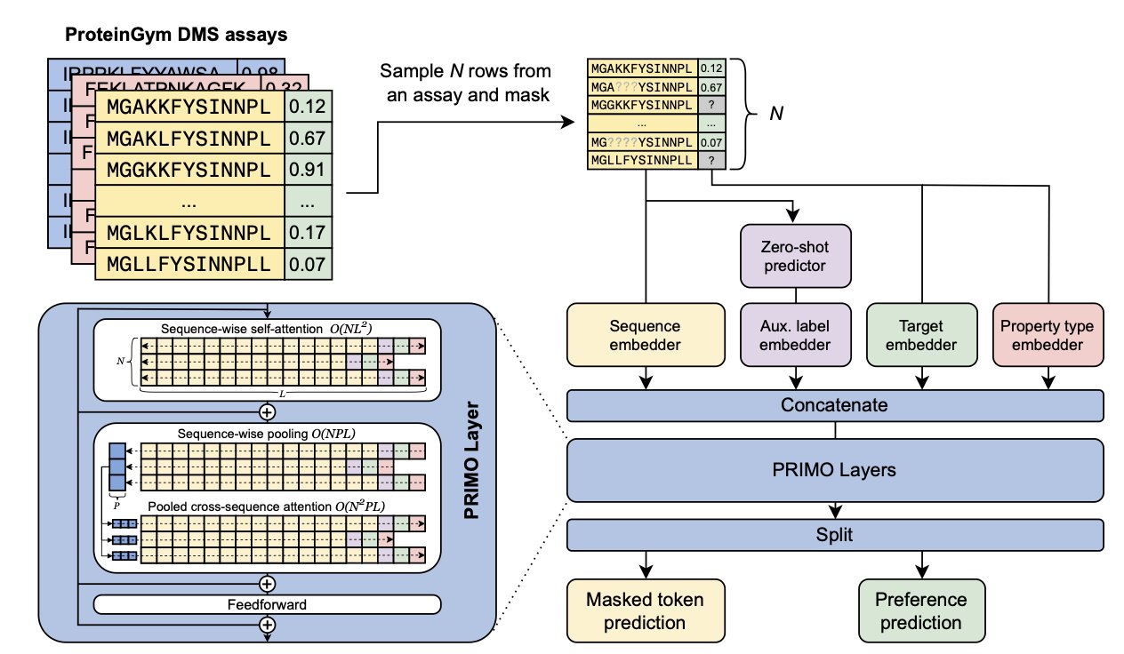 PRIMO uses an in-context learning approach similar to GPT: you show the model a few examples like “mutant A has high activity, mutant B has low activity,” and it learns to predict the activity of mutant C.
