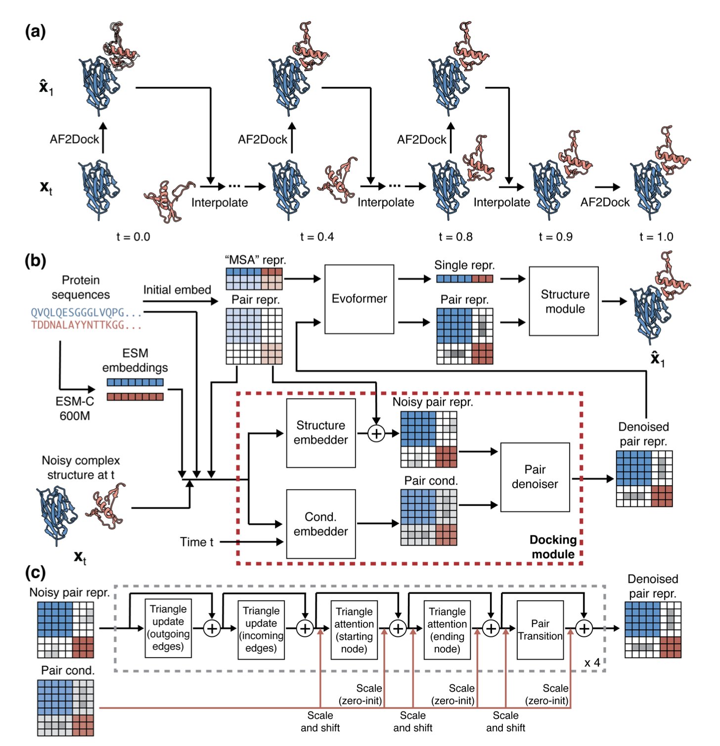 - AF2Dock uses flow matching to turn AlphaFold-Multimer into a docking tool that doesn’t need MSAs. It works well on tasks like antibody-antigen docking where co-evolutionary signals are missing, but it could still be better at handling protein flexibility.