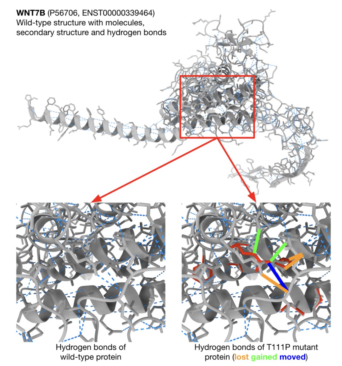 For example, with the T111P variant in the WNT7B gene, DAVE gives a high pathogenicity score and clearly states why: the mutation significantly alters folding energy and causes a loss of hydrogen bonds. This gives a precise direction for follow-up functional experiments, allowing researchers to directly test protein stability.