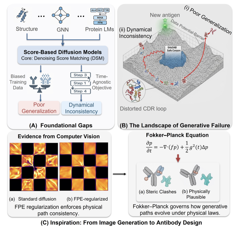 They applied the Fokker–Planck equation. This equation acts like a “navigation system,” describing how amino acid residues move from a highly disordered, noisy state to a stable, ordered, and correct antibody structure. Traditional diffusion models tend to accumulate errors at each denoising step, causing the final result to deviate from the true conformation.