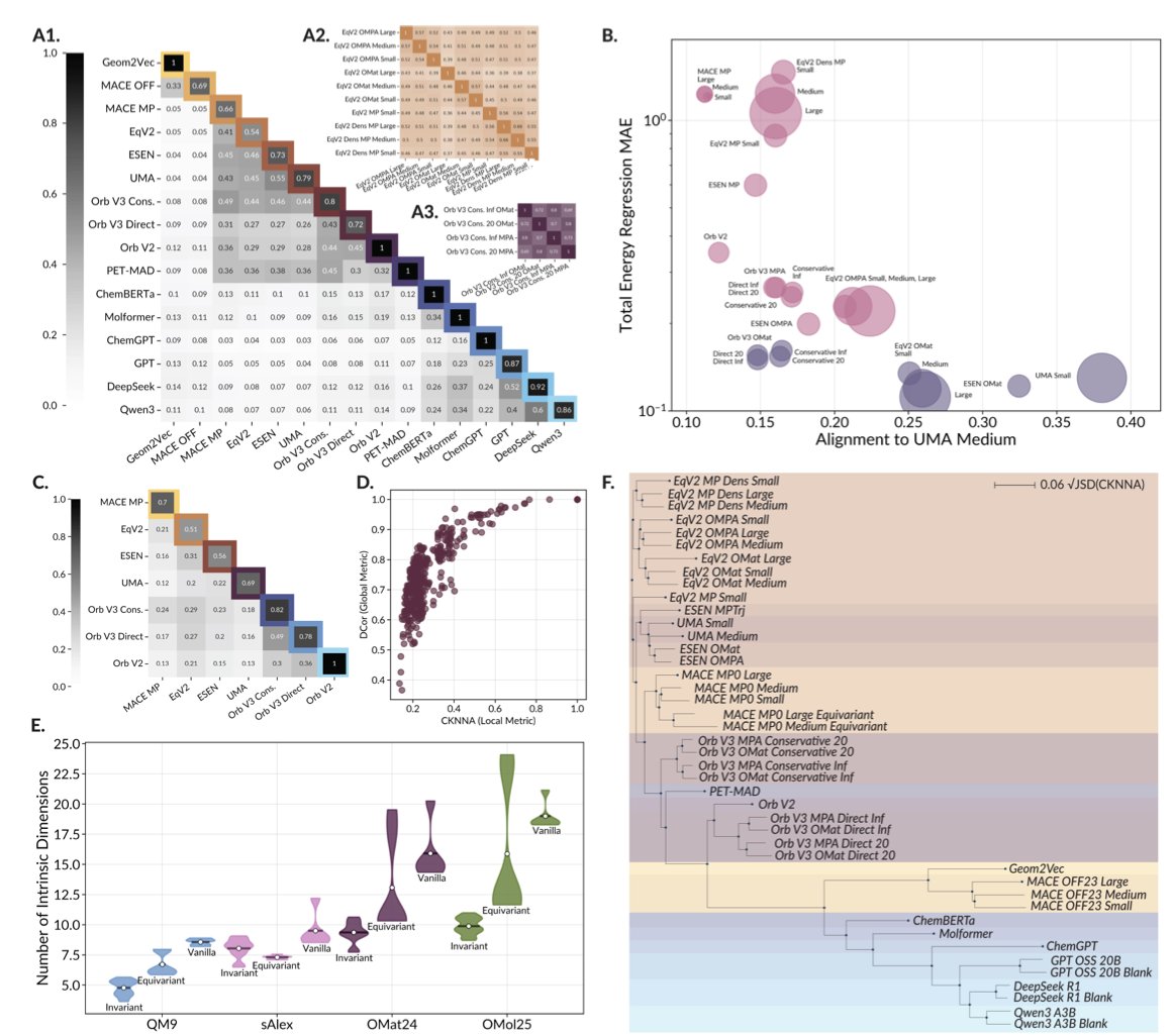 The researchers analyzed nearly 60 leading scientific foundation models. These models take all sorts of inputs: some read SMILES strings, others see molecules as graphs, and still others process 3D molecular structures. You would expect their internal ways of processing information (their “representations”) to be very different.