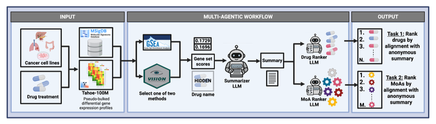 Next, the system feeds the list of enriched pathways and other results to a Large Language Model (LLM). The LLM then acts like an experienced biologist, connecting these clues to write a fluent summary explaining the drug’s potential Mechanism of Action (MoA). For example: “This drug may act by inhibiting DNA repair pathways, as several gene sets related to the DNA damage response were significantly activated.”