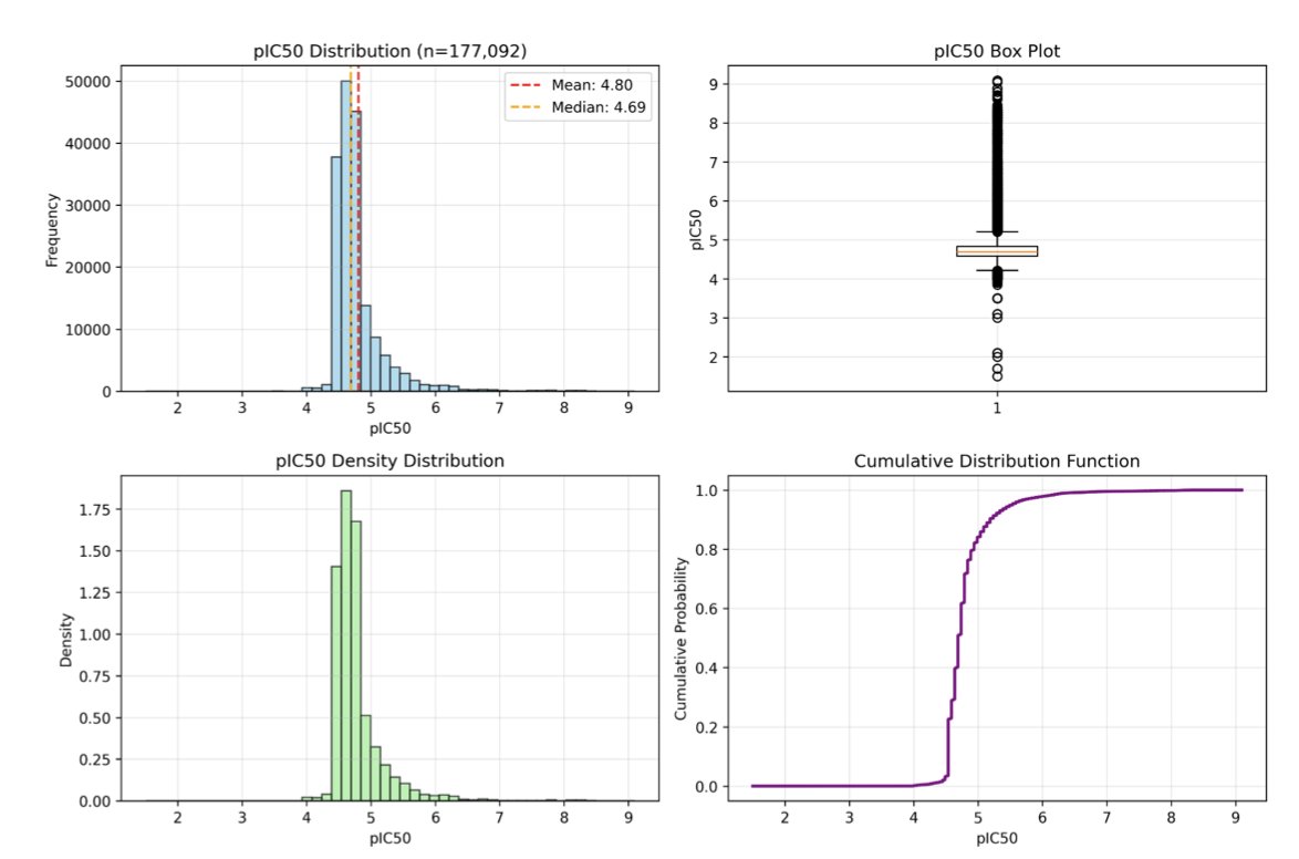 The foundation of any model is data. The researchers collected 177,092 test compounds for TDP1 from multiple databases to build their dataset. This dataset faced a classic problem: it was extremely imbalanced, with only 2.1% of the molecules being active compounds. If a model just learned to predict every molecule as “inactive,” it could achieve 97.9% accuracy, but this would be useless in practice. To solve this, the researchers used stratified sampling and sample weighting to ensure the model could learn to identify the rare active molecules.