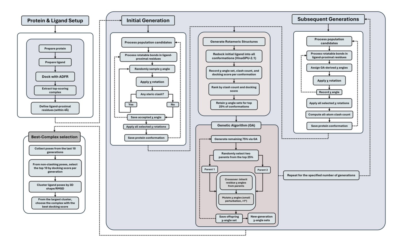 The researchers used a Genetic Algorithm. You can think of this process as a sophisticated evolutionary system. The system’s population includes not just the various poses of the small molecule (ligand) but also the torsion angles (χ angles) of all the side chains in the protein’s pocket.