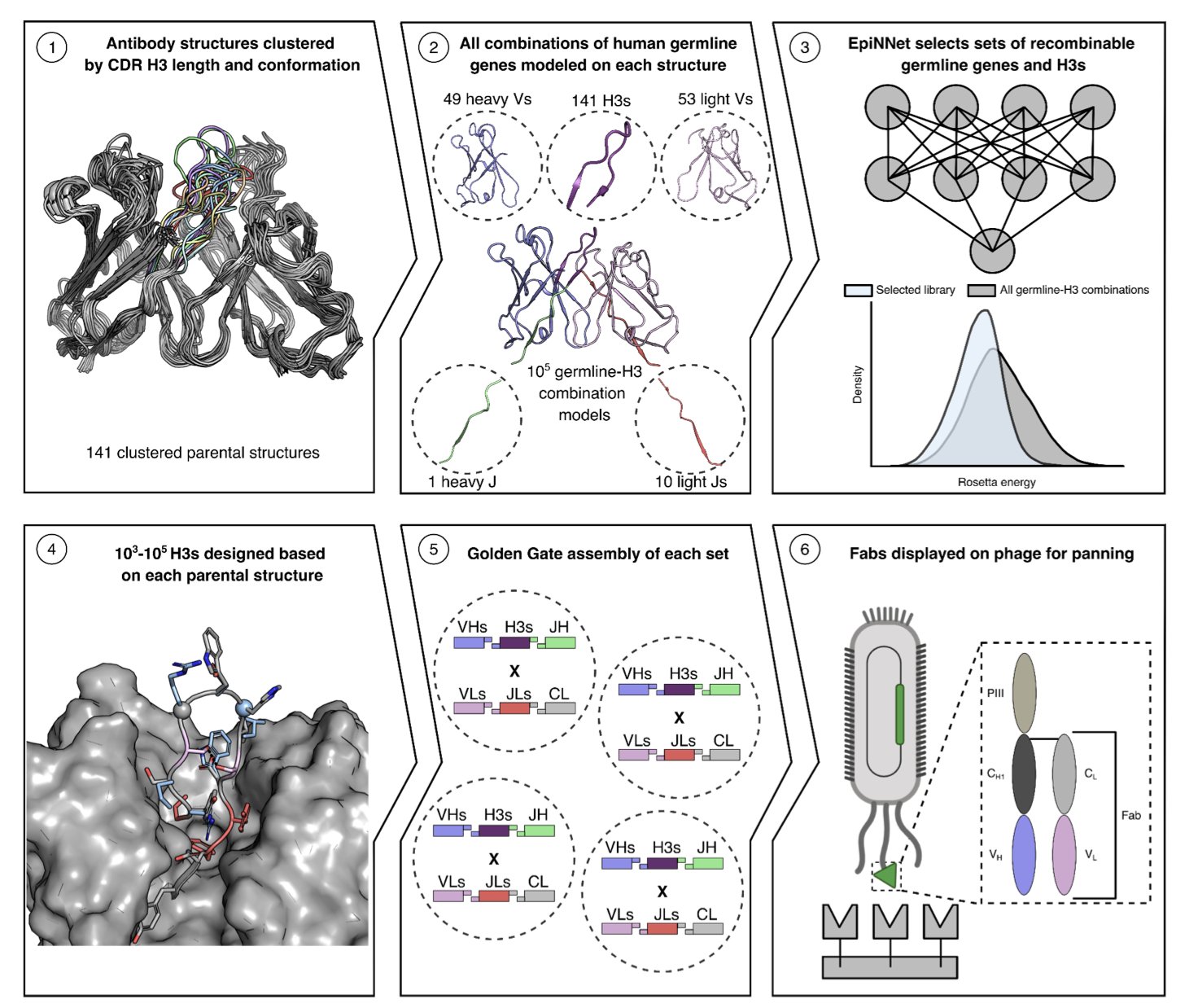 First, it tackles the stability of the antibody framework. Antibodies are formed by pairing heavy- and light-chain variable regions (V-genes). Instead of random combinations, the researchers used Rosetta energy calculation software to systematically evaluate the interface binding energy of all possible human V-gene pairs. They selected only the pairs calculated to be most stable and least likely to dissociate to serve as the library’s scaffolds. This is like building a house on an incredibly solid foundation to ensure the entire structure is sound.
