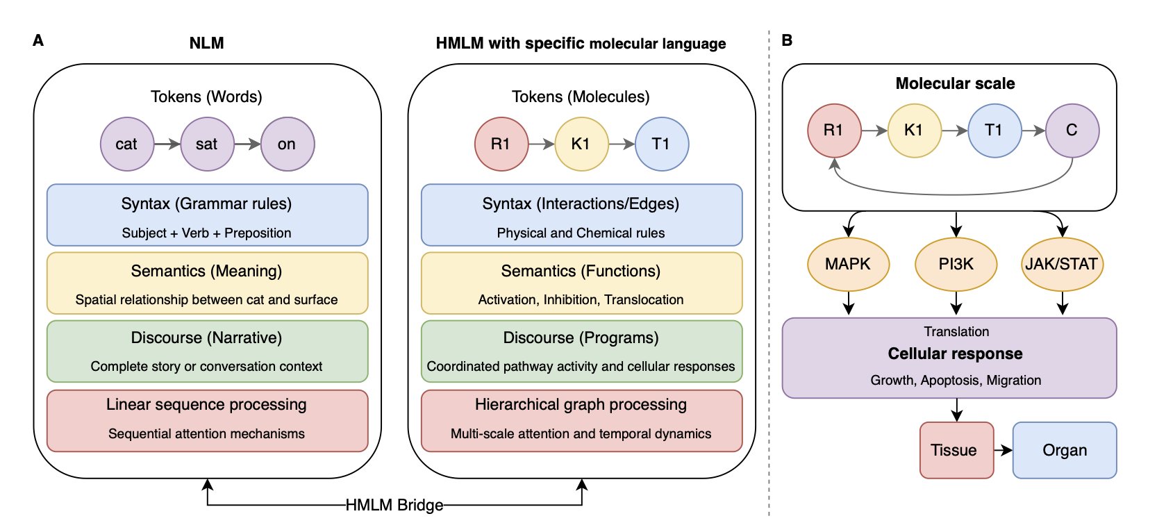 - HMLM treats molecules like words, using a hierarchical attention mechanism to accurately predict cell signaling dynamics. It significantly outperforms traditional models and has revealed potential drug target cross-talk between mTOR and STAT3.
