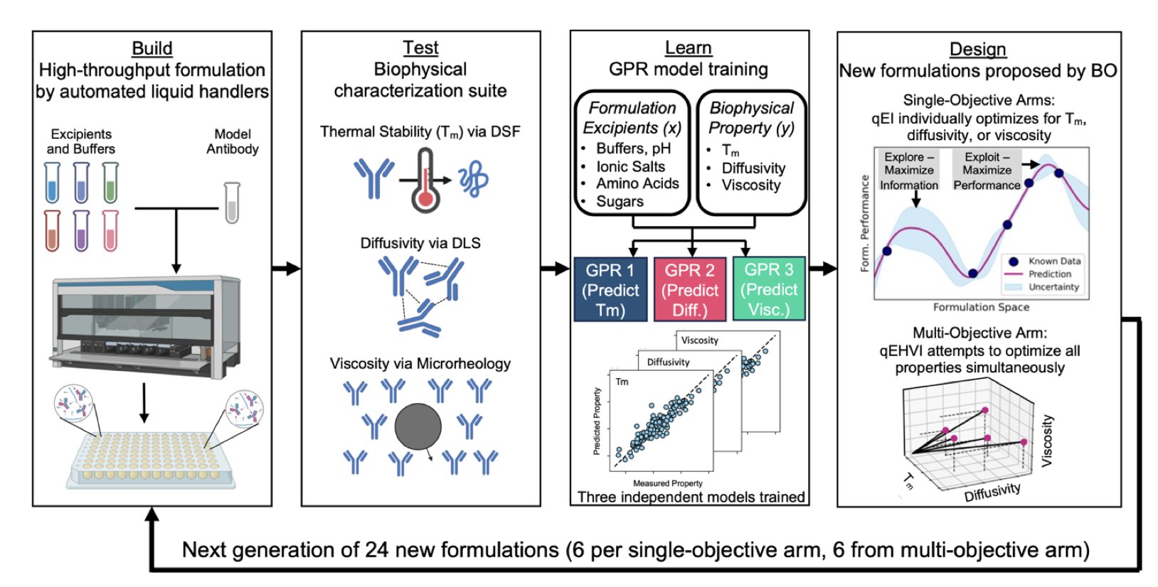 - Researchers combine machine learning and robotics to create a high-throughput platform for antibody formulation, efficiently screening and optimizing for stability, viscosity, and diffusivity.