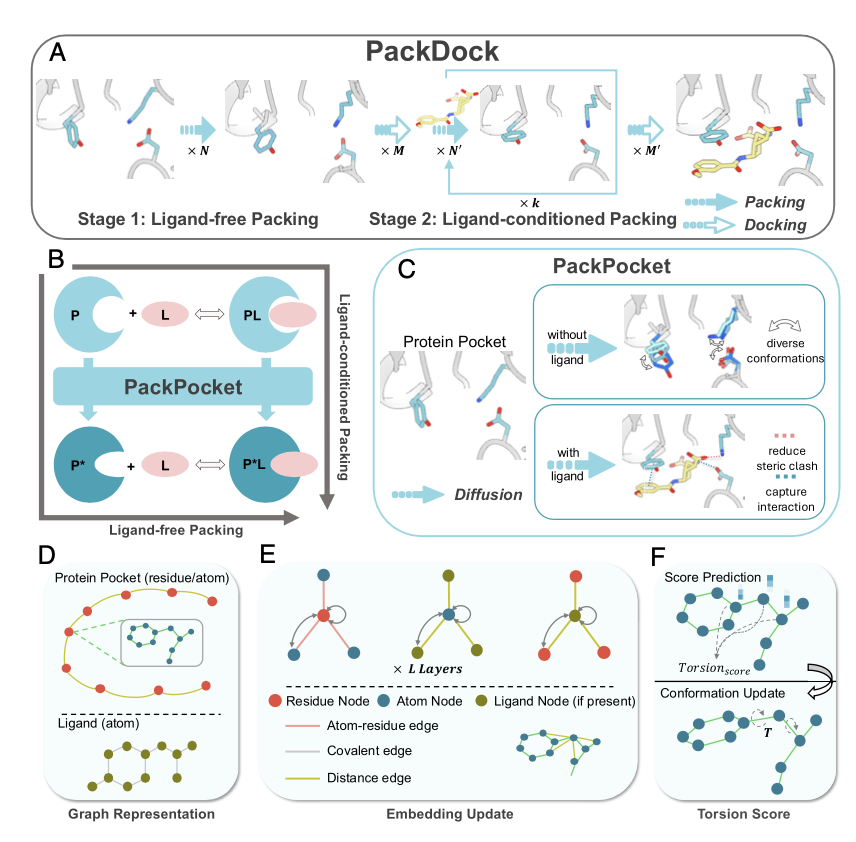 The core of PackDock is a module called PackPocket, which uses a diffusion model. If you’re familiar with AI image generation, you know how powerful diffusion models are at creating images. They start with random noise and gradually “denoise” it to produce a realistic picture. PackPocket does something similar, but instead of images, it generates the 3D conformations of amino acid side chains in a protein’s binding pocket. It can sample conformations for both ligand-free (apo) and ligand-bound (holo) states of the pocket.