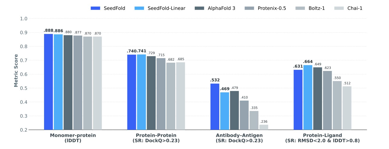 And the results did not disappoint. On FoldBench, the industry-standard benchmark, SeedFold outperformed AlphaFold3 on several tasks, especially in antibody-antigen interactions and protein-RNA interactions. Its linear variant also performed very well on protein-small molecule interaction prediction, a key area of interest for drug developers.