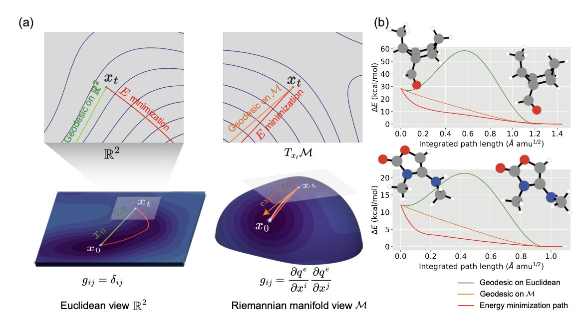 Here is how it works. First, you take a perfect molecular structure and add some random “noise” to it, nudging it away from its lowest energy point. The model’s job is then to learn how to push the perturbed molecule back to its original state along the “shortest path” (a geodesic) on the manifold. Because this path follows the “valley” of the energy landscape, it’s much more efficient and accurate.