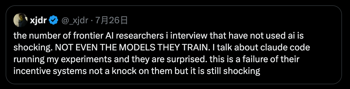 Shipper 还转发了一条有趣的观察,指出许多前沿 AI 研究员甚至从未使用过他们自己训练的模型。他评论道:“这是你不需要成为一个高技术研究员,也能以令人惊讶和新颖的方式使用 LLM 的一大原因。”